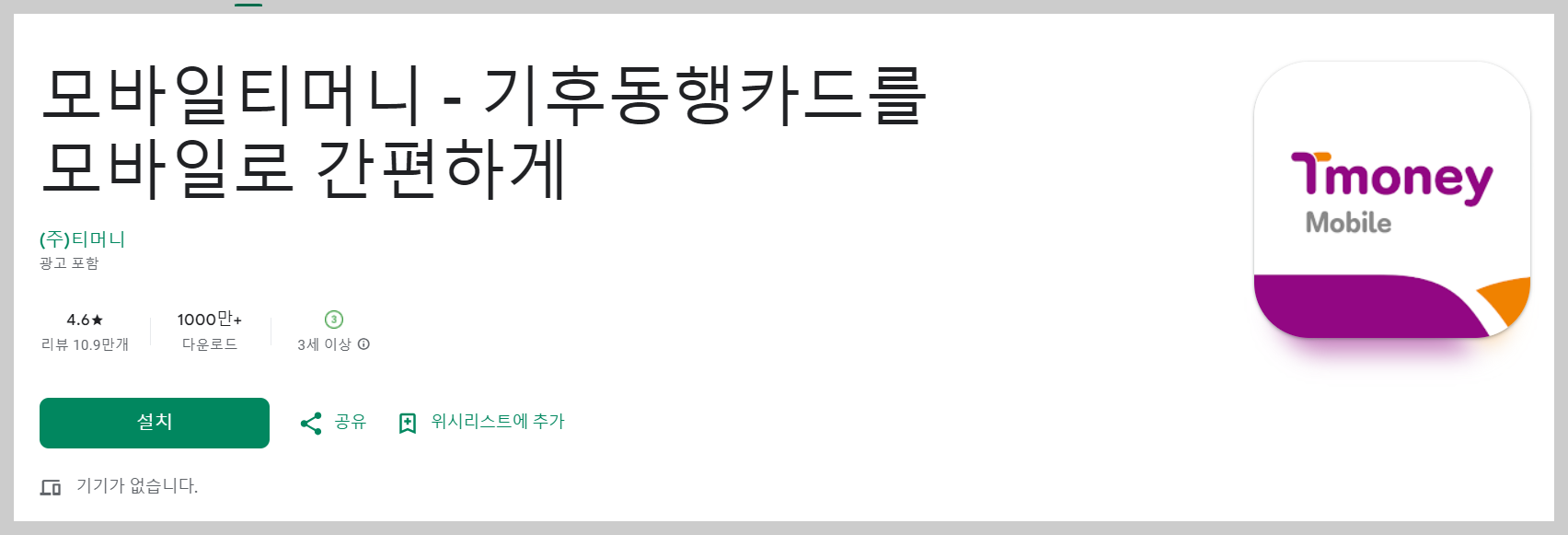 모바일 카드는 안드로이드 OS 12 이상 기반의 휴대전화(삼성, LG, 구글 등)에서 티머니앱을 다운하셔서, 사용하시면 됩니다. 모바일에 구글플레이로 접속하여, 아래 이미지를 클릭하여 티머니 앱을 다운받으세요!