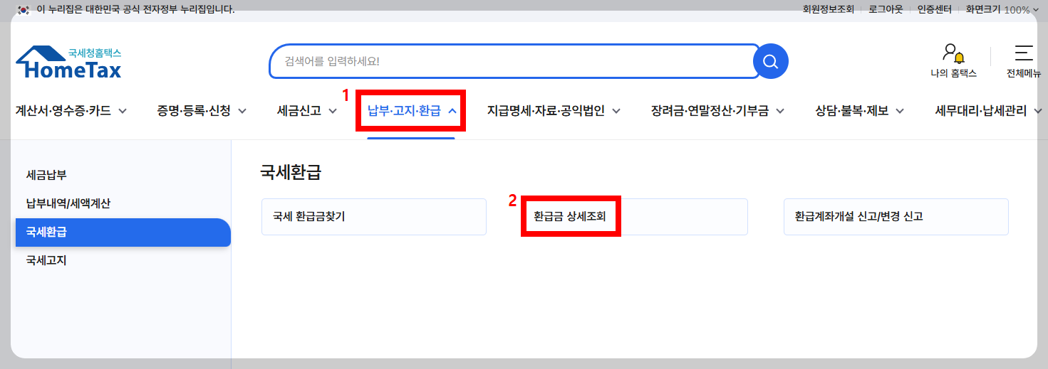 2) 환급 금액 조회 메뉴로 이동